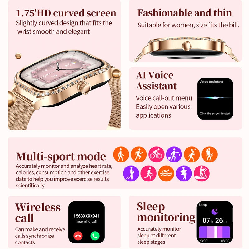 Women’s Smartwatch – 1.75" Curved Screen, Bluetooth Call